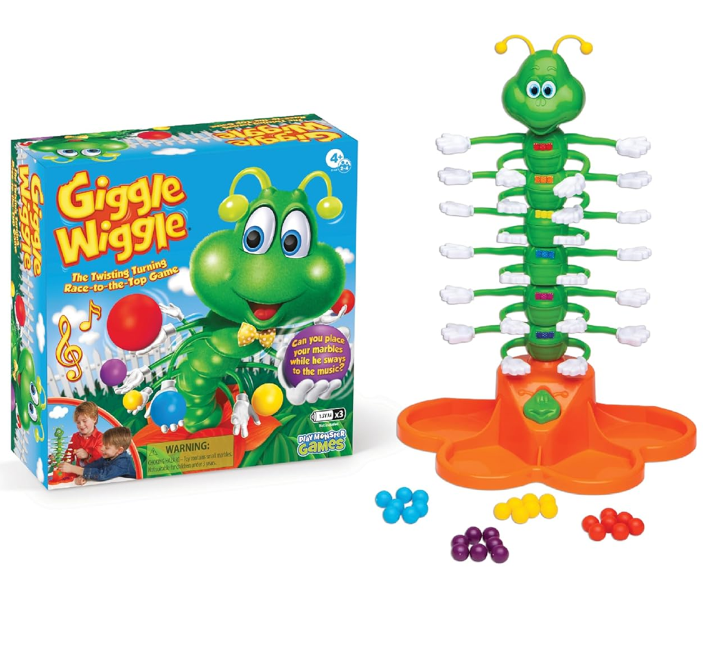 Giggle Wiggle is a vibrant caterpillar that loves to dance to catchy tunes. As he sways and grooves, players race to place their colored marbles into his outstretched hands. But be warned; his wiggly moves can send marbles tumbling! The first player to successfully place all their marbles wins the game.